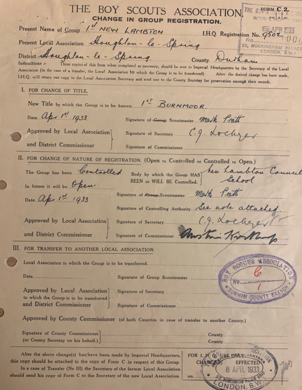 On the 6th of April 1933, the group’s name was changed to 1st Burnmoor. In the early 1930s, Mr. W. G. Henderson, an insurance agent, became Scoutmaster. He had previously served as a Scoutmaster at 1st Herrington.