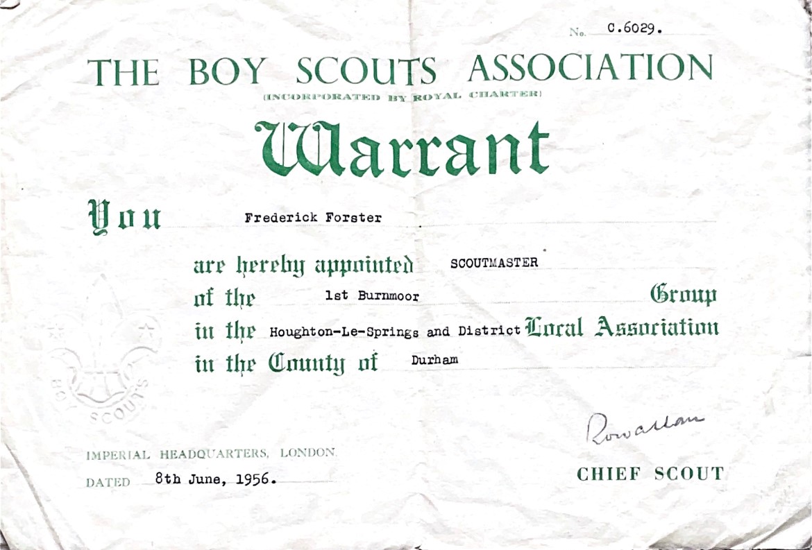 On the 8th of June 1956, Frederick (Fred) Forster, a bricklayer and council area foreman, became Scoutmaster. The son of Robert Forster, Fred was a major influence on the group’s leaders and members and was a highly respected member of the community.