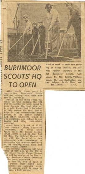 When the NCB Hall had its lead stolen from the roof, Alan Nicholson convinced the group that it was time to build their own HQ. Local people and businesses raised money through Scout dances, Beetle Drives, and by selling bacon sandwiches from a caravan by the Burnside Club, cooked by May Mathews and Marjorie Forster.